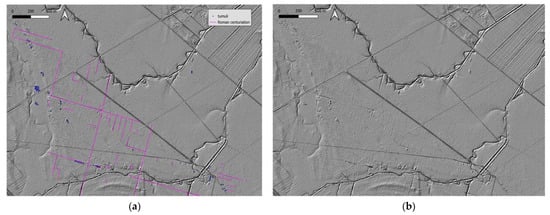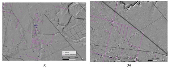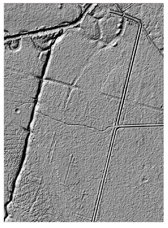 The division identified on LIDAR visualization presented a typical Roman centuriated landscape (Figure 6). Limites were formed by drains or ditches, frequently flanked by trees and henges [35] (Figure 1 in that text). That is why the edges of ditches were usually elevated. Both ditches and hedges were visible on LIDAR data visualisations (Figure 3). The inner grid was also made by ditches and hedges, as documented elsewhere (e.g., [36]) and observed in this analysis (Figure 3 and Figure 4, and Figures 11–13).