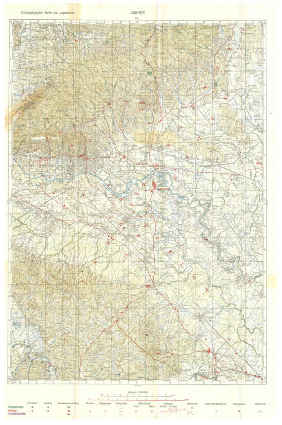 - Klemenc, J. Archeologische Karte von Jugoslawien, Blatt Zagreb; Akademie der Wissenschaften: Belgrade, Serbia, 1938. [Google Scholar]