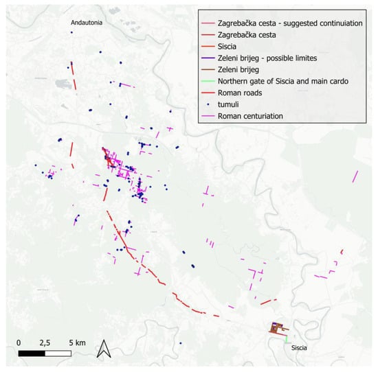The remains of the road entering Siscia at the northern gate were discovered along the present day Zagrebačka cesta, confirming the direction suggested from the 18th century. This road has the same orientation as centuriation (Figure 8). This road crosses Odra River, close to the confluence with Kupa River. In 1968, the remains of a Roman bridge were discovered nearby [45] and interpreted as a bridge connecting the road leading to Andautonia [45]. The remains of the road in the N-E direction were found in the area of Zeleni brijeg in two places [45], also following the 15-degree azimuth, in the Roman period as today.