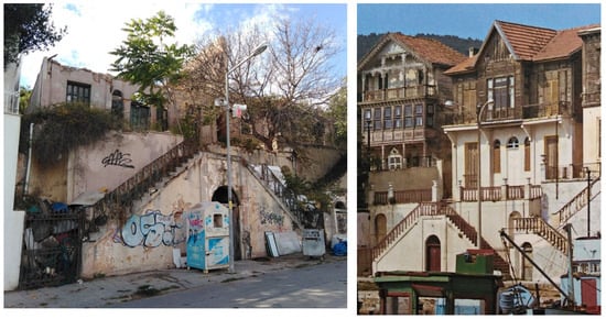 Villas and large mansions are found in the extensions of the settlements (Appendix B, Figure A3). These buildings usually have open spaces in front of the main door, creating monumental entrances. Sometimes, the approach from the public space is made by monumental staircases with double spirals and opposite arrangements. In other cases, there are usually stairs leading to the entrance, either at an upper level or at a lower level. These buildings are placed in the middle of their gardens and are characterized by their symmetry. Centrally on the façade, there is a “sahnisi” (closed balcony) or a balcony supported on consoles and crowned with a simple pediment, or a pediment including the attic at a higher level, or in other simpler manner, which certainly makes an impression.