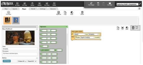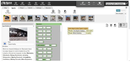 For the development of the application, the “TaleBlazer” [19] software platform was chosen, as it is one of the friendliest environments for the application creator. TaleBlazer is an open-source platform for developing geolocation-based AR games for both outdoor and indoor environments. Developed by the Massachusetts Institute of Technology (MIT), it features a block-based visual programming environment, allowing commands to be inserted without any previous programming knowledge. TaleBlazer is suitable for people without programming experience, as it allows the design of interactive applications in a simple and understandable way. The choice of TaleBlazer was based on study-specific criteria such as ease of use, geolocation integration, and free availability. In contrast, other available low-level platforms, such as Unity, Vuforia, or Apple’s ARKit, provide greater flexibility and realistic visualization capabilities, but require significant programming expertise and greater development resources [5]. Therefore, TaleBlazer was chosen because it best meets the educational and research needs of this study, while maintaining an easy-to-use and sustainable development environment.