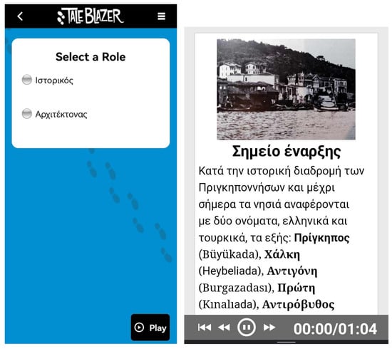 For the audio part, as was mentioned before, we have chosen the TTS maker in order to make a small audio part for the first and the fourth stop in both routes. This platform allows us to insert the text we want and the music part as a background to convert it into a whole audio part (Figure 12). The music part we chose is called “Tesoro mio” from Becucci [21], a piece of music which was famous in the early 20th century, which was played a lot on the Princes’ Islands, information that we learnt from the writer Halid Ziya Uşaklıgil [9] (pp. 67–68). Both of the audio parts that are used enhance the narrative, and the users who evaluated the application approved this addition, and they suggested we use it in all of the stations.