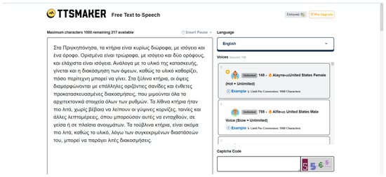 - TTS Maker. Available online: https://ttsmaker.com/el (accessed on 23 March 2025).