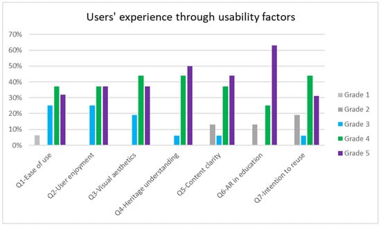 As for the third research question, the results of Table 1 show that the majority of students claimed that the application is relatively user-friendly and easy to use, since the factors “Usability and Use” and “User Experience” have a median = 4. The median of factor “Learning” ranges between 4–5, indicating that this application is extremely useful to someone who wants to enrich their knowledge with new content related to cultural heritage. Last but not least, the median of question 7, which represents the factor of “Intent to use”, is also 4, showing that the majority of the students who used the application will possibly recommend it to friends and visitors. Therefore, we can see that positive results were obtained, which is a common element with previous research and applications [6,7,8].