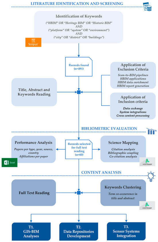 These qualities have led to its frequent use as the sole source not only in some of the above-mentioned reviews [16,19,20] but also more broadly in recent reviews addressing the state of digital and emerging technologies in the AEC (Architecture, Engineering, and Construction) sector [23,24,25,26]. The search strategy employed Boolean operators to combine three sets of keywords related to (i) technology (“HBIM” OR “Heritage BIM” OR “Historic BIM”); (ii) target (“platform” OR “system” OR “environment”); and (iii) context (“city” OR “district” OR “buildings”).