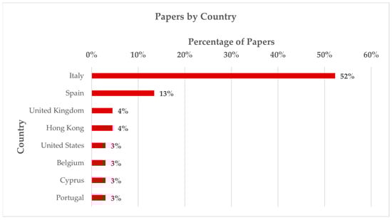 The performance analysis in this review was based on the classification of papers according to the following criteria: type (Figure 2), source (Figure 3), year (Figure 4), country (Figure 5), countries contributing to a single paper (Figure 6), number of institutions/departments contributing to a single paper (Figure 7), and number of papers involving authors from non-academic fields, such as enterprises and public bodies. The classification by country and number of institutions/departments considered all co-author affiliations.