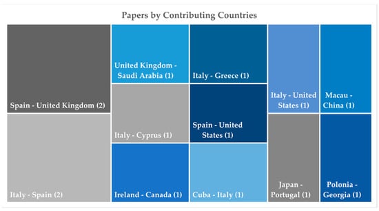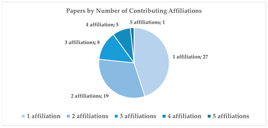 Nevertheless, the research demonstrates a solid profile of international collaboration, with about 25% of papers involving institutions from at least two countries (Figure 6), and it shows a strong interdisciplinary collaboration, with 34 papers including researchers from different affiliations (Figure 7). Furthermore, the complexity and technological transfer potential of the research are underscored by a notable presence, approximately 15%, of papers (nine out of 60) including authors from outside the academic domain (Garibaldi Fragasso srl, Italy; B.Re.D srl, Italy; Office of Public Works, Ireland; Ove Arup and Partners, Hong Kong; Iperboole srl, Italy; GEOLAMBERT Company, Morocco; Grupo Empresarial GEOCUBA, Cuba; AESEI srl, Italy; FULL, the Future Urban Legacy Lab, Italy).