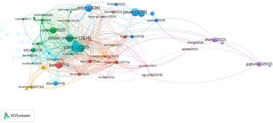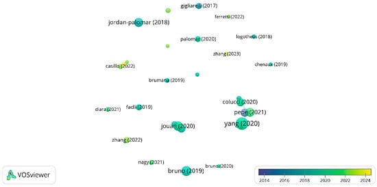 The analysis was supported by VOSViewer 1.6.20 for the science mapping. Initially, the citation analysis of the documents (Figure 8) was conducted. This emphasizes the significance of the authors, and consequently the research groups and institutions, whose studies on the topic have the most substantial impact in terms of scientific dissemination within the dataset. The analysis also considers the correlation between the number of citations and the year of publication.