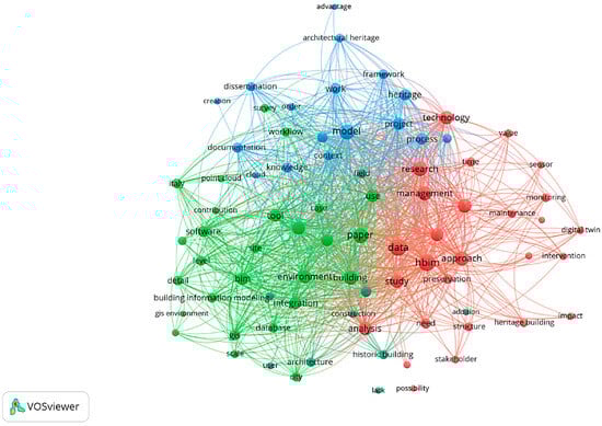 The second cluster (red), including specific words such as “sensor, monitoring, maintenance, structure, time, and analysis”, refers to the use of measurement devices for detecting and observing building-related parameters over a period, aiming at performance assessment and control.