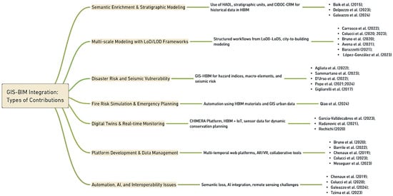 As shown in Table 1, a growing body of literature demonstrates that HBIM-related IDPs have found application in several intersecting domains. Conservation and restoration remain foundational, where HBIM provides detailed semantic models that support documentation, diagnostic interpretation, and long-term planning. These models are often enriched with material properties, historical stratification, and condition assessments, while GIS contributes the environmental, cadastral, and infrastructural context necessary for interpreting heritage assets within their broader urban or territorial settings. In this sense, integration facilitates the shift from isolated architectural studies to holistic heritage management strategies.