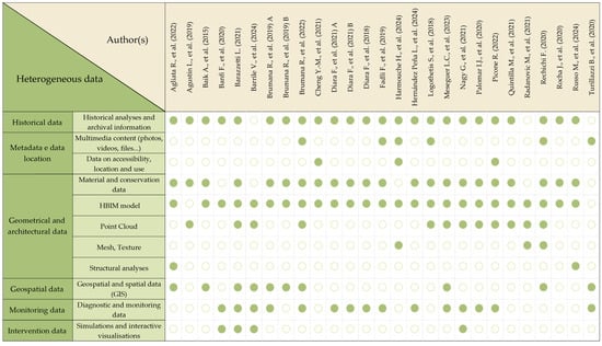 A number of studies have been conducted that offer in-depth analyses of specific aspects of HBIM case studies. These include information types and storage [16], open software tools and setup, parametric modeling, semantic features, data exchange, and cloud accessibility [17]. Other studies have focused on specific application domains, such as archaeology [18] and post-disaster reconstructions [19].
