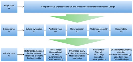 To construct a scientifically grounded and interpretable AHP hierarchy for evaluating the sustainable design potential of blue-and-white porcelain patterns, a three-level structure was established. This hierarchy includes: