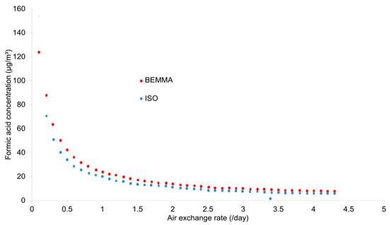 The published target levels for formic acid for the BEMMA and ISO 16000-based scheme are 15 and 12 µg/m3, respectively. The test parameters for BEMMA are: sample loading—34 m2/m3, chamber volume—0.05 m3, and AER—38.06/day. For the ISO16000-based tests, the loading factor was 1 m2/m3, volume chamber 0.25 m3, and AER 0.18/day. The well-validated Meyer–Hermanns equation [] was applied to this data. It determines what concentrations would be expected for different AERs at given loadings of emissive material. The formic acid concentrations were calculated for showcases 1.0 by 0.5 by 0.3 m, giving a loading of 3.33 m2/m3. The expected formic acid concentration was calculated at 0.1 intervals of air exchange rate between 0.1 and 3.0 per day.