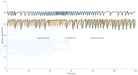 Performance and carbon footprints for showcases and silica gel control have been previously published []. Six existing showcases and three test showcases were used to investigate the energy used to maintain a 40–42% RH band, as recommended. Air exchange rates were measured with the carbon dioxide tracer gas method to ISO 12569. Energy consumption was measured using energy meters (Maxico Dual Tariff), and embedded carbon was estimated by weighing and identification of components to BS PAS 2050 of Munters MG50, Miniclima EBC08, and Hahn RK2. The UK electricity mix has an emission factor of 0.20493 kg CO2-eq per kWh [], which can be used to convert the consumption figures. The temperature and RH inside the showcase and in the room were measured with Rotronic Hygroclip II probes. Calculations for lifetimes between silica gel changes have been extensively tested []. Calculations were undertaken for each showcase, assuming Prosorb conditioned to 40%. The time to reach 42% and the need for reconditioning was calculated. This depends on the date the Prosorb is added to the showcase (due to seasonal variations in room RH). Calculations were undertaken on the 1st of the months of January, April, August, and October. For the test showcases, room temperature and RH were altered with electric heaters and Munters MG90 dehumidifiers and MGS 300 humidifiers. The RH values were selected for quite damp UK rooms. Such values are probably representative of many locations, with the exception of the tropics. Lower RH values would require some humidification from the units or buffering from sorbents. Tests were run for 10 days, with the first 3 days ignored to allow the Miniclima and RK2 units to settle. The showcase air exchange rates of the three test showcases were reduced by adding 3M 425 tape. Some of the experiments were repeated with a 40–50% RH band. For the dehumidifier, the separate Meaco LAE controller was set appropriately. Both Miniclima and RK2 have factory-set hysteresis values, which cannot be changed. The set points were raised from 41% to 45%. The test showcase conditions are summarised in Table 2. Those for the existing showcases in historic buildings are shown in Table 3.
