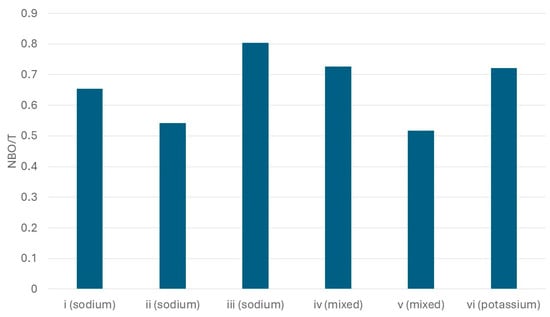 The durability of the glass samples was assessed by quantifying the balance of their network formers that make up the insoluble glass and network modifiers that disrupt this structure, making it easier to melt and work but also more chemically unstable. These network modifiers create loosely chemically bound non-bridging oxygens (NBO), therefore breaking the links between the glass-forming silica (SiO2) tetrahedra (T). The normalised quantitative analyses of the glasses produced were used to calculate the theoretical stability of the glass matrix. This was performed by obtaining the ratio of NBO-to-T within the glass structure and provides an estimate of the degree of cross-linking. The closer the ratio NBO/T is to zero, the more the glass corresponds to pure silica, which has four oxygen atoms per one of silicon and no NBOs []. The equation employed for this process (Equation (1)) is based on the separation of glass formers, modifiers, and intermediates, according to the works of Mysen [,] and Pollard et al. [].