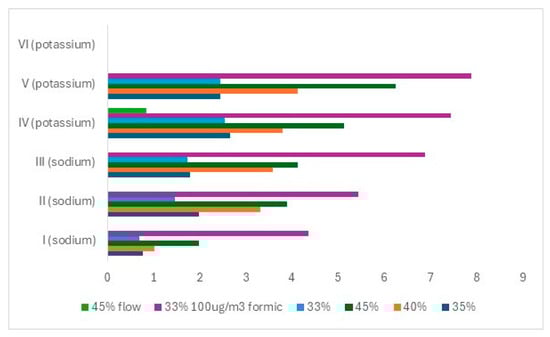 The continuous RK2 system reduced the formic acid concentration below the detection limit in all trials. Both the dehumidifier and Miniclima-controlled cases had formic acid present above the reported threshold (30.5 µg/m3) due to their intermittent operation. Higher room RH levels reduced the formic acid present.