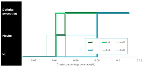 Conservator A perceived crystals at lower percentage coverages than Conservator B in all instances. The magnification helped, but Conservator A only rated 0.03% coverage as maybe and did not perceive 0.01% coverage at all, even with ×10 magnification. The ion chromatography easily detected both these levels and had an estimated detection limit 10x smaller than the lowest level tested (giving a coverage of 0.01%).