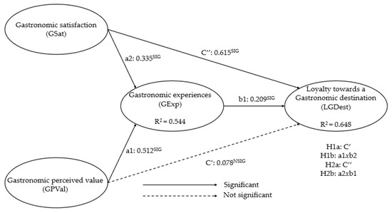 The results obtained reveal the full mediating role of the variable “gastronomic experiences between perceived gastronomic value” and “loyalty to a gastronomic destination”, thus confirming hypothesis 1b (H1b) and, consequently, rejecting hypothesis 1a (H1a). On the other hand, there is no mediating power of gastronomic experiences between the variables “gastronomic satisfaction” and “loyalty towards a gastronomic destination”, and, consequently, neither hypothesis 2a nor 2b is supported (H2a and H2b).