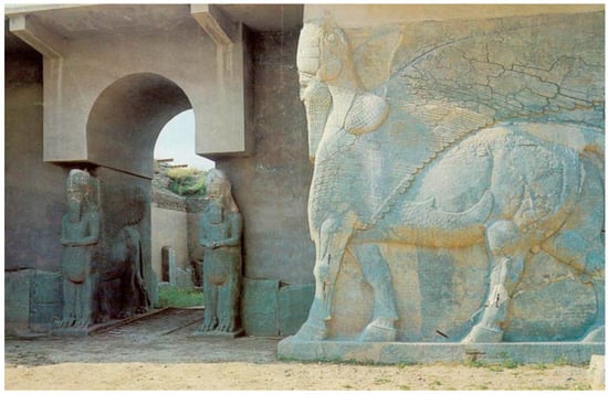 “L’avenir ne peut être qu’aux fantômes. Et le passé.” (J. Derrida). Between 883 and 859 BCE, in the ancient city of Kalhu (Nimrud)—the newly established administrative capital of the Assyrian Empire located 30 km southeast of modern-day Mosul (Iraq)—King Ashurnasirpal II initiates a building campaign that includes the construction of the so-called Northwest Palace, made of mud-brick walls and timber reinforcements. Monumental lamassu statues—creatures with human heads and animal bodies—guard the entrance to the grand throne room of the palace, emerging from three portals as “apotropaic magical beasts” [] (p. 230) (Figure 1).