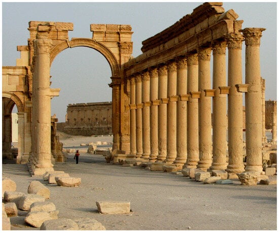In the second quarter of the third century CE, in the ancient city of Palmyra (Syria), a monumental arch is added to a larger pre-existing system of colonnaded streets (Figure 2 and Figure 3). Built from local limestone, it features a large central arch flanked by two narrower ones. The structure belongs to the central section of the so-called Great Colonnade, which stretches approximately 1.1 km, connecting the Sanctuary of Bēl at the southeastern end of the city to the Funerary Temple in the northwestern part (Figure 3) [,,,,,,]