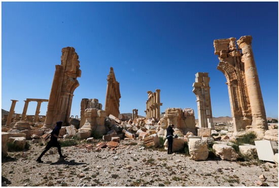 - Taylor, A. The Problem with Rebuilding a Palmyra Ruin Destroyed by ISIS—Does It Simply Help Assad? The Washington Post, 20 April 2016. Available online: https://www.washingtonpost.com/news/worldviews/wp/2016/04/20/the-problem-with-rebuilding-a-roman-ruin-destroyed-by-isis-does-it-simply-help-assad/ (accessed on 12 May 2025).