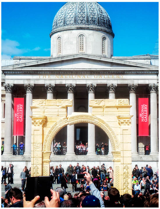 - Eastaugh, S. Palmyra’s Ancient Triumphal Arch Resurrected in London’s Trafalgar Square; Cable News Network: USA. 2016. Available online: https://edition.cnn.com/style/article/palmyra-triumphal-arch-replica-london/index.html (accessed on 12 May 2025).