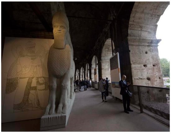 Turning to the Rinascere dalle Distruzioni exhibition, the actions of the Claimants must be evaluated based on (a) the presentation of the Ob (‘copies’), (b) the role of the Authors of Ob as Claimants, and (c) the political discourses surrounding the Ob made by cultural heritage experts and political figures acting as Claimants. At the Colosseum, the ‘replicas’ were displayed alongside labels and panels describing the archaeological and historical contexts of the lost originals (Event 8). For example, the lamassu from Nimrud was presented alongside drawings depicting the reliefs that adorned the walls of the royal palace (Figure 7). The displayed panels and the exhibition catalog offered further explanations about the technical steps and challenges encountered in producing the ‘replicas’ in the absence of a physical model, highlighting the distinctions between the ‘copies’ and the ‘originals’.9 Thereby, the exhibition at the Colosseum offers alternative approaches to some of the challenges posed by the IDA’s arch—most notably, the importance of recognizing the degree of accuracy of the ‘replicas’ and the necessity of providing contextual information about their entire “biography”. Moreover, the Incontro di Civiltà association, along with other public and private institutions, like Priorità Cultura, spearheaded a series of commendable initiatives and interventions, which have significantly advanced the current knowledge on the restoration and reconstruction of damaged cultural heritage. Their intellectual, cultural, diplomatic, and political efforts not only raised public awareness about these critical issues but also made substantial contributions to the prevention and protection of endangered or damaged cultural heritage. In this regard, one of the key outcomes of the Rinascere dalle Distruzioni project has been the use of the created ‘replicas’ as educational tools in universities and museums, following a recent, but widespread, trend in museum education [,,].