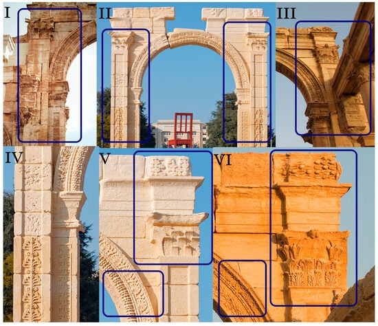 Despite Roger Michael’s claim that the decorative features of the arch are “completely indistinguishable from the original” [], many significant details have either been roughly rendered or entirely omitted (Figure 9) [,]. On the external pilasters, the acanthus leaves of the Corinthian capitals have been heavily schematized and simplified, disregarding the original number, form, and intricacy of the carving (Figure 9V,VI). Corinthian capitals, originally integrated into the shafts of these pilasters to support the architrave of the colonnaded street extending from the arch, have been entirely omitted (Figure 9I–III). Moreover, the vegetal decoration along the shaft is not only oversimplified but also positioned higher than that in the ancient monument (Figure 9I,IV). The capitals and floral frames of the internal pilasters, as well as the intricate decoration of the voussoir, have likewise been drastically simplified (Figure 9IV–VI). While the ancient arch belonged to a complex architectural structure, with a façade comprising three arches (none of which survived ISIL’s destruction), only the central arch has been replicated (Figure 2, Figure 5 and Figure 6).