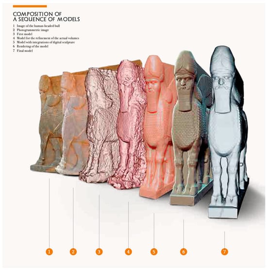 Sequence of the different models used to create the lamassu replica for the Rising from Destruction—Ebla, Nimrud, Palmyra exhibition ([] (p. 53)). Courtesy of Nicola Salvioli, used with permission.