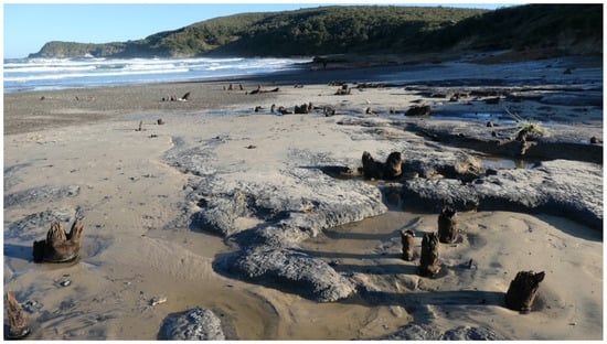 The drowning and preservation of ancient coastal forests can occur in response to both passive and active mechanisms, and here the focus is on the former. The primary passive mechanism of submergence is through relative sea-level rise by gradual land subsidence, uplift, or eustatic changes over centurial to millennial time scales (e.g., [,,,,,,,,]). Active mechanisms can operate over much shorter periods, sometimes within hours, and include episodic events such as sudden crustal movements and storm surges from tropical or extra-tropical storms [,,,]. These mechanisms are not mutually exclusive, with episodic storms potentially exacerbating submergence by destabilising barrier ecosystems (e.g., []. Conversely, storms and coastal erosion are the main means of subsequent exhumation and discovery of buried forests and associated organic deposits [,,] (Figure 1).
