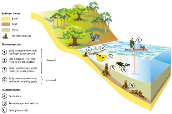 Conceptual model showing the record of submerged tree remains and their sedimentological-topographical traits as well as selected research devices for nearshore sampling (reproduced with permission from Kaiser et al. []; their Figure 7, CCC licence 1581826-1).