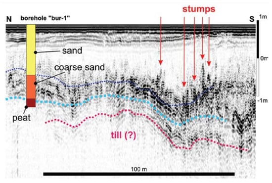 For nearshore and intertidal sites, documentation and sampling are often tide-dependent, and typically conducted at low tide for optimal exposure []. Techniques such as aerial LiDAR, drones, and high-resolution photogrammetry provide detailed elevation models, while pedestrian surveys allow for visual assessment and targeted sampling of partially exposed stumps, preservation conditions, and sediment features. To detect subsurface features, methods like ground-penetrating radar (GPR) (Figure 3), parametric echosounding, and terrestrial electric and electromagnetic induction (EMI) have been employed [,], though no single method serves as a universal solution [].