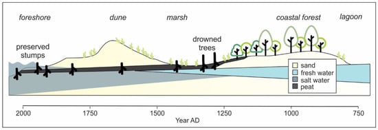 Conceptual model of environmental evolution of palaeoforest site, including subfossil stumps along eroding shoreface, landward migrating barrier beach and dune system, stumps and preserved tree trunks in the high marsh environment and healthy forest along upper border (modified from Maio et al. []; their Figure 6).