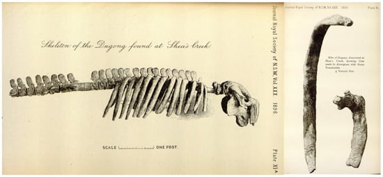 Skeleton of the dugong found at Shea Creek (left), and close up the ribs (right) showing cut marks (from Etheridge et al. []; their Plates XIa and XI, respectively).