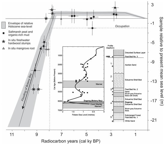 Although no absolute dates were obtained during the initial study, the authors write that, “…Neolithic man may have inhabited Botany Bay when the ocean level was about five feet [~150 cm] lower than present” or, if the stone axes were in situ, “… at perhaps even a more remote period” [], p. 180. Comparison with the sea-level curve of Sloss et al. [] puts this at around 8000 Cal ky BP ago (Figure 6). Subsequent radiocarbon dates of the dugong bones from this site provided age estimates of 6541–6145 Cal BP (adjusted for marine residence time) []. Ages of wood samples (Eucalyptus resinifera and Angophora costata) found under marine sediments within a few kilometres of the dugong site provided ages between 10,180 and 8457 Cal ky BP. Comparison of this older age estimate with the sea-level curve of Sloss et al. [] indicates initial post-Glacial flooding of the Botany Bay with water levels around 19 m below present (Figure 6).