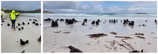 In October 2024, reports of another intertidal forest site, this one along Badger Beach in northern Tasmania, were highlighted in the news (Figure 9). According to the news reports, many of the trees were clumped together, resembling the trunk structures of Melaleuca spp. and were embedded in fine mud as “soft like plasticine” []. An aboriginal educator, a Palawa man, also indicated the trees were most likely an ancient Melaleuca spp. or tea tree forest and culturally significant. The trees provided support for all others to grow and are viewed as elders by the Palawa community [].