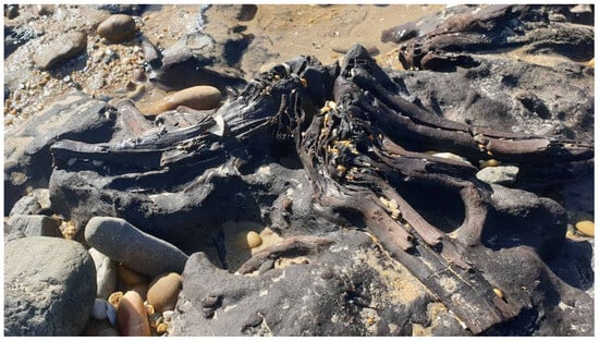 - Powell, S.; Barralough, A. School Holiday Makers Delight as an Ancient Forest of ’Elder Trees’ Emerges on a Tasmanian Beach. ABC News, 8 October 2024. Available online: https://www.abc.net.au/news/2024-10-08/tas-storm-surge-unearths-petrified-forest-on-tasmanian-beach/104440088 (accessed on 15 January 2024).
