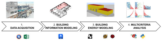 The workflow adopted for the study is divided into four main phases, as shown in Figure 2. These phases are (1) data acquisition, (2) building information modeling, (3) building energy modeling, and (4) multicriteria analysis.