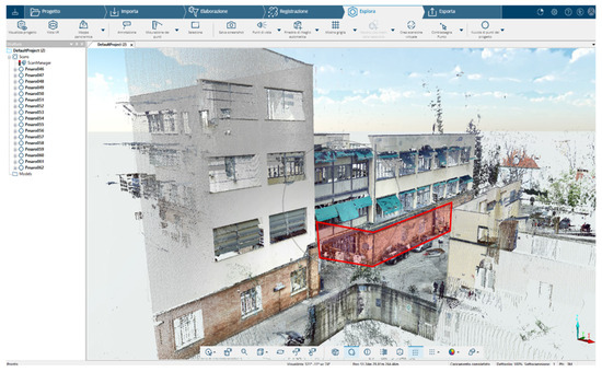 Terrestrial laser scanner of the classroom (highlighted in red) and adjacent zones in FARO SCENE 2022.2 (2024). The survey was conducted using a FARO CAM2 FOCUS 3D laser scanner (University of Bologna, Bologna, Italy) using a targetless approach, necessitating 15 scans with a resolution of 7.67 mm/10 m and a quality filter of 3×.