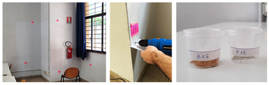 Figure 4. XRD tests performed on the building. Left: identification of sampling points; center: extraction of samples; right: selected brick and plaster samples used for analysis. XRD enabled precise identification of the mineralogical composition of original masonry and plaster, overcoming gaps in historical documentation of the building. The technique confirmed the presence of traditional fired-clay brick substrates and mapped the locations of concealed reinforced-concrete pillars within the wall assemblies.