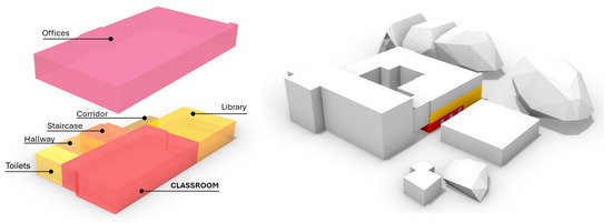 The first step involved recreating only the volumetric part of the building under analysis. In Rhino [21], a 3D modeling software package, the geometries of the relevant zones from the BIM model (the classroom and its adjacent spaces) were imported and re-traced using Grasshopper (GH) (vv.1.0.00008) and Rhino Inside Revit [22] via the algorithm presented in previous articles [17], which allows direct connection between Revit and EnergyPlus in a biunivocal manner to recognize three-dimensional BIM objects.