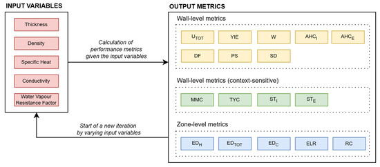 A further GH algorithm was finally executed to perform the multicriteria analysis, evaluating performance metrics at both the wall and zone levels. This algorithm was conceived through an iterative logic that allows for comparing multiple insulation solutions by randomly varying input material properties within specified ranges and calculating their performance characteristics and impacts. The iterative model was implemented using the GH Anemone component [25], which enables the creation of loops and the definition of the number of iterations to be performed. It was paired with a script that, at each iteration, generates a random value within a predefined input range. During each cycle, the five input parameters change in a semi-random manner, producing corresponding numerical values for the outputs under analysis. At the end of each iteration, Anemone’s “LoopEnd” component records the generated values, thus ensuring the traceability of the results. These results are exported to Excel at the end of the process for further analysis. Figure 9 outlines the logic behind this algorithm.