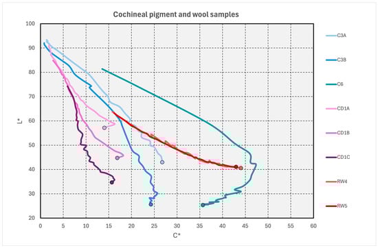 - Rader Bowers, L.M.; Schmidtke Sobeck, S.J. Impact of Medium and Ambient Environment on the Photodegradation of Carmine in Solution and Paints. Dye. Pigm. 2016, 127, 18–24. [Google Scholar] [CrossRef]