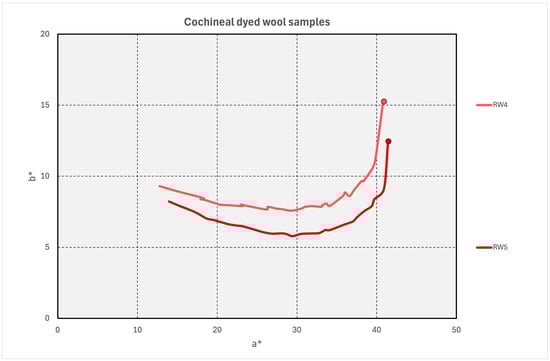 | RW5 | Cochineal (mordanted + alum, D-tartaric acid, salt and sandalwood; dyed + gum arabic, alum, salt and turmeric) |