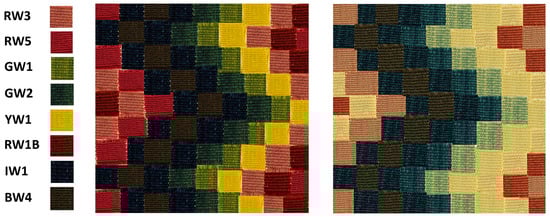 | RW4 | Cochineal (mordanted + alum, D-tartaric acid, salt and sandalwood; dyed + starch, salt and turmeric) |