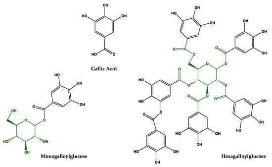 Chemical structures of gallic acid, monogalloyl glucose, and hexagalloyl glucose. For gallic acid, the main functional group is based on a carboxylic acid, and the others are based on an ester. Phenolic OH groups are also important in the formation of the iron(II)-phenol complex. The galloyl esters of glucose can also be referred to as gallotannins.