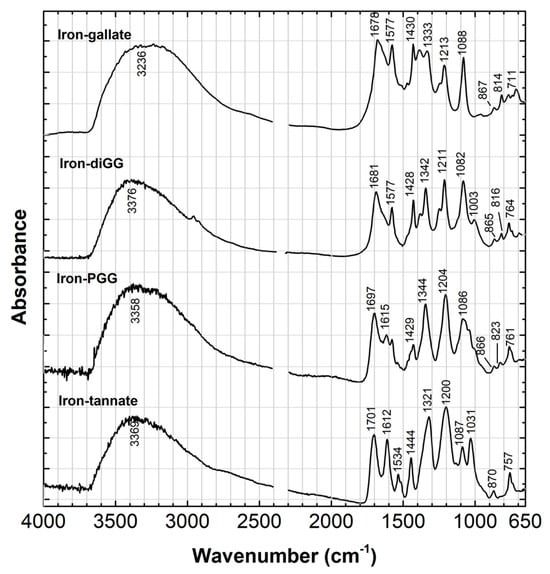 We started by depicting the infrared spectra for a series of precipitates based on iron complexes with gallate (iron gallate), digallate (iron–diGG), pentagallate (iron–PGG), and tannate (iron–tannate), Figure 2. The main markers were identified in orange, Table 4. For iron gallate, the marker bands were 1678 cm−1 and 1333 cm−1. For iron–diGG, bands were at 1681 cm−1 and 1342 cm−1. For iron–PGG, bands were at 1697 cm−1 and 1344 cm−1. For iron–tannate, bands were at 1701 cm−1 and 1321 cm−1. Based on these marker bands, we discuss the infrared spectra of the final recipes.