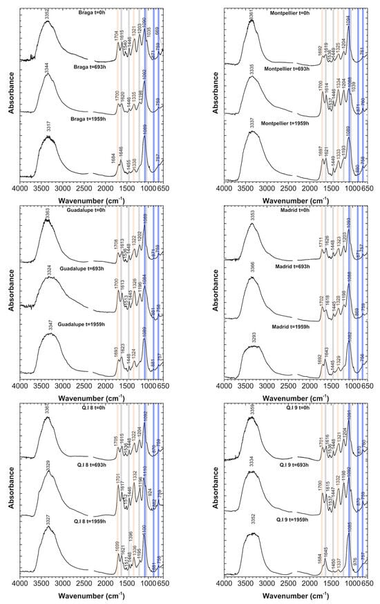 Infrared spectra for the following inks: Braga, Montpellier, Guadalupe, Madrid, QI.8, and QI.9, at t = 0 h, t = 693 h, and t = 1959 h. Studied as precipitates on a glass slide. For the meaning of the color bars, see Table 4.