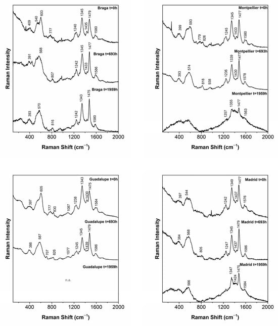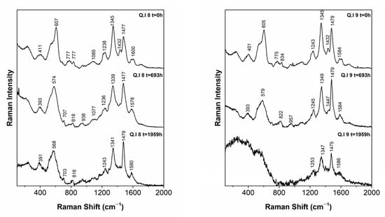 In Figure 4, we can verify the different behaviors of the paints in the degradation experiment using Raman spectroscopy. At t = 693 h, the inks were in good condition. However, at t = 1959 h, the most degraded inks were Montpellier, Guadalupe, Madrid, and QI.9. During the last degradation period, a spectrum of the Guadalupe ink could not be obtained. The only blacks that maintained the profile and bands corresponding to an iron gall ink were the Braga and QI.8 [5,16].
