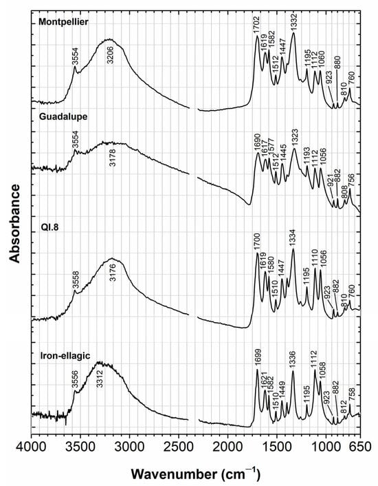 Infrared spectra for degradation products at 1959 h (orbital shaker at 50 °C), for Montpellier, Guadalupe, and QI.8 applied on filter paper. Compared with a complex of iron with ellagic acid.